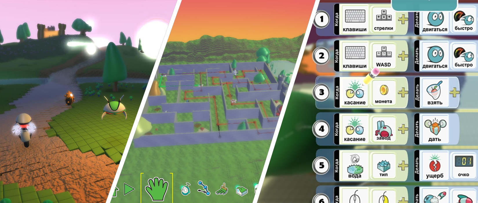 Коду, знакомит детей с логикой программирования и способами решения проблем, обходясь без сложного синтаксиса, что подходит тем, кто только начинает познавать азы создания игр.